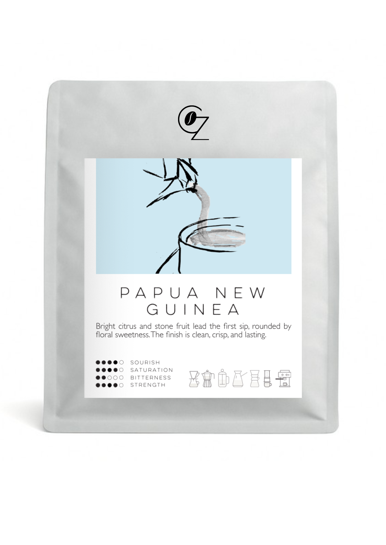 Ljus, livfull och delikat lager på lager – detta kaffe öppnar med mousserande toner av citrus och saftiga stenfrukter som nektarin och plommon. Blommig sötma rundar av koppen och skapar en mjuk men dynamisk profil. Avslutningen är ren, krispig och dröjsmål, vilket lämnar ett uppfriskande intryck med varje klunk, 100 % Arabica. Odlade i höglandet i Papua Nya Guinea, ofta på höjder över 1 600 meter, trivs dessa bönor i rik vulkanisk jord och frodiga regnskogsförhållanden. Det mesta kaffet produceras av småbrukare med traditionella metoder med låg inblandning – och den vilda, naturliga karaktären lyser igenom i koppen. Tvättad bearbetning och odling på hög höjd bidrar till dess klarhet och komplexitet, som påminner om östafrikanska kaffesorter, men med en mjukare, mer tropisk twist.